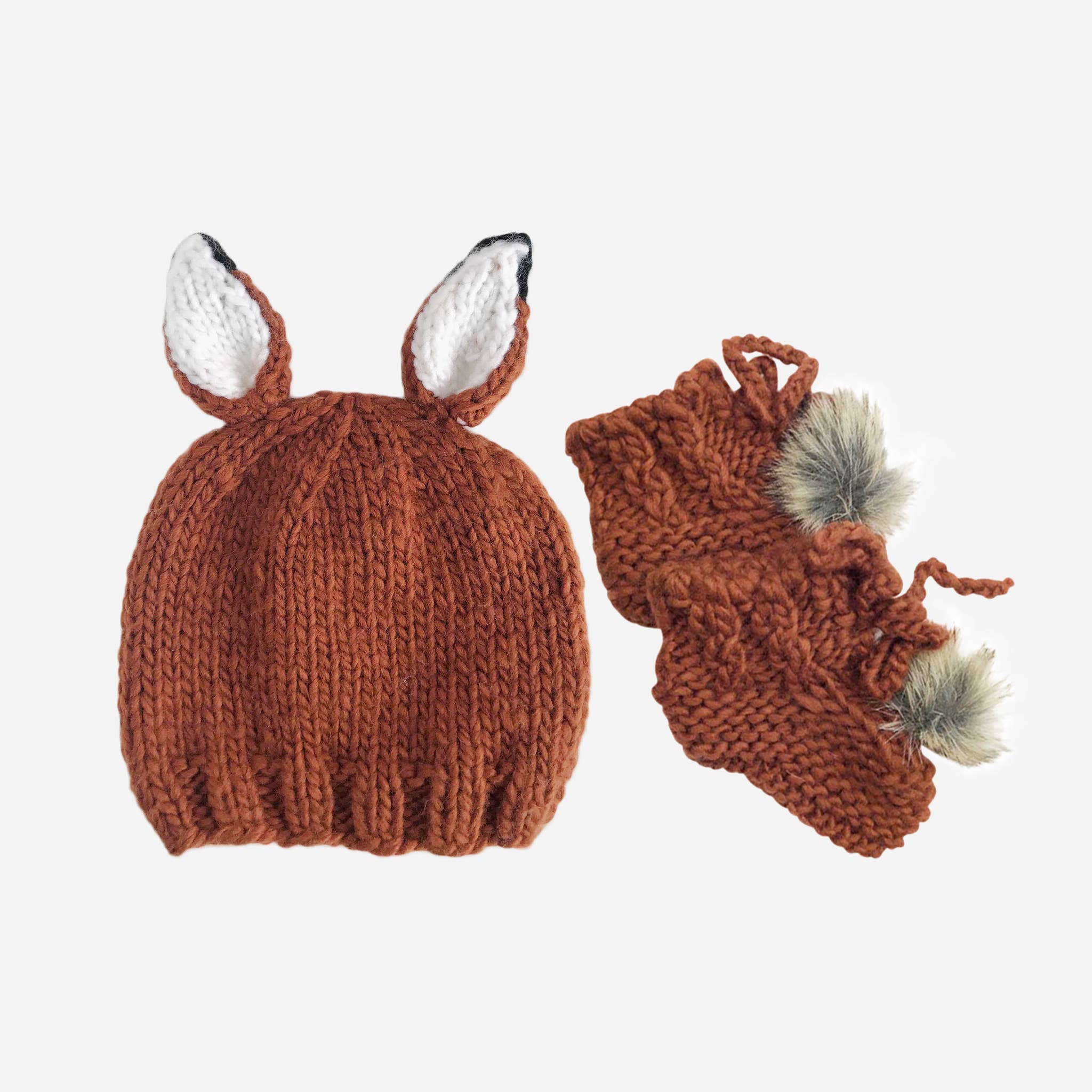 Fall baby necessity for Halloween costume or just cause. A special hat and booties set thoughtfully put together for your Little Fierce One. Includes a hand-knit Fox hat in our Cinnamon and a pair of hand-knit booties with faux fur poms in our Cinnamon color.
