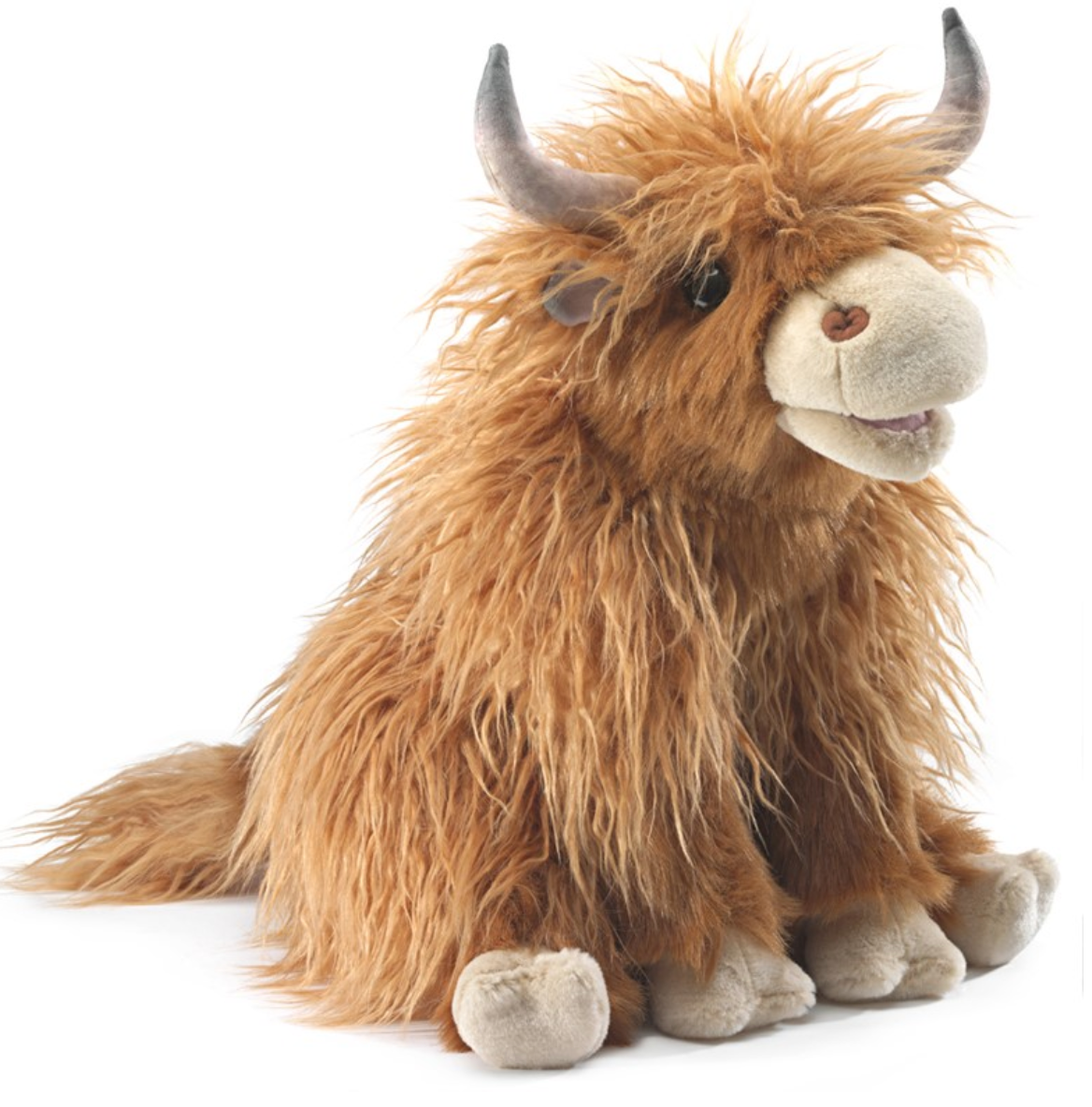 A "moo"vable mouth gives life to the extraordinary Folkmanis® Highland Cow puppet. Known for having a gentle demeanor, this rustic cattle breed features distinctive long horns and a ginger colored, wavy, wooly coat to warm your heart.